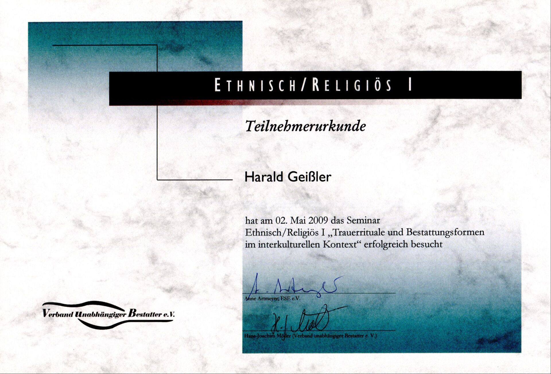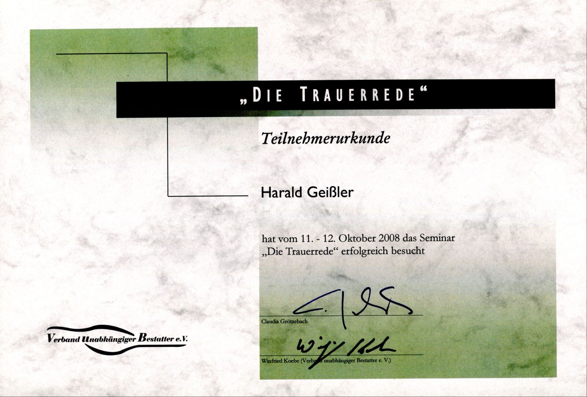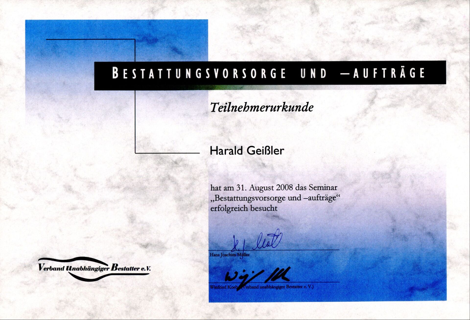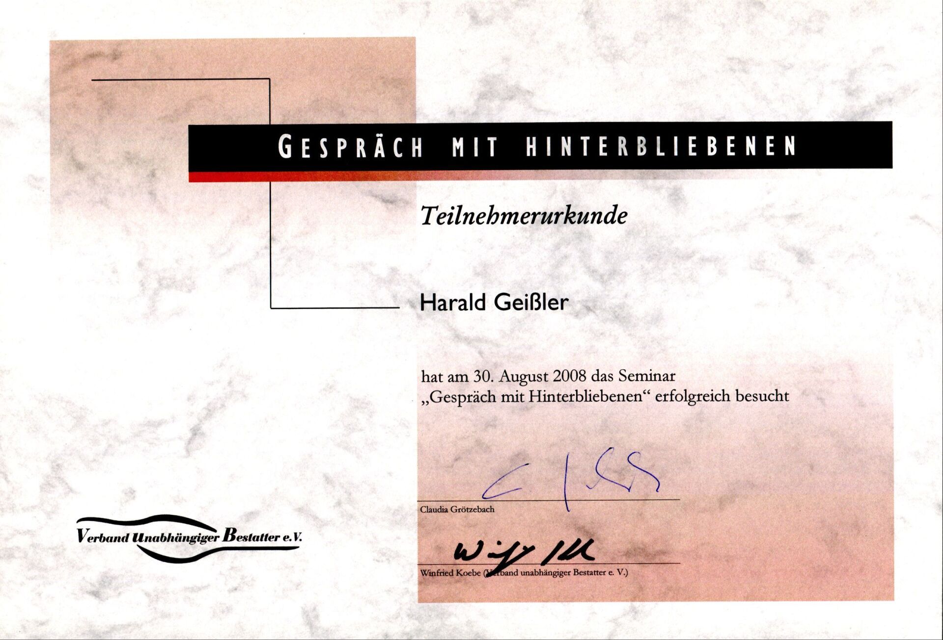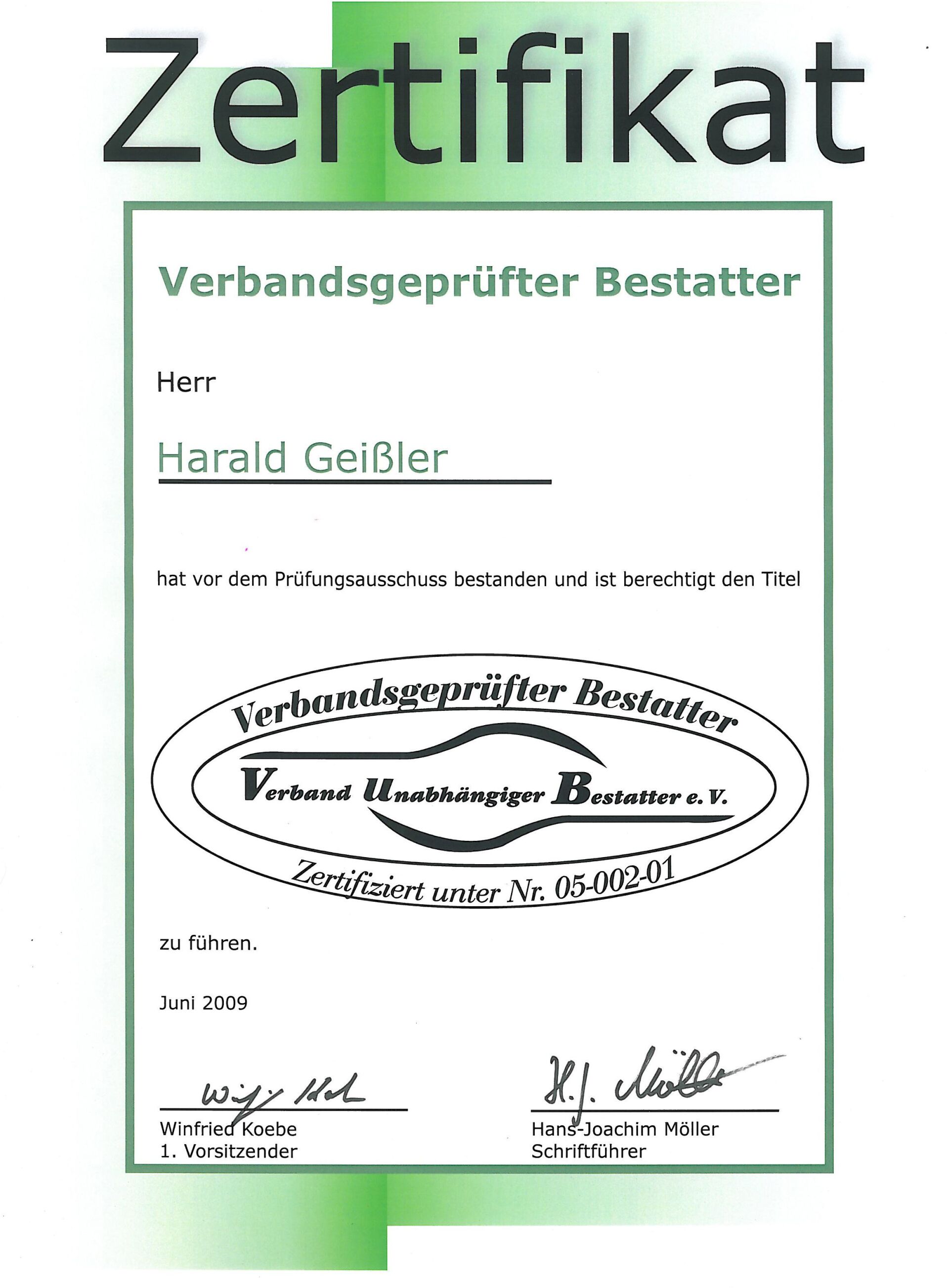 Wir vom Bestattungs-Institut Harald Geißler sind bereits in der fünften Generation für Sie da und unterstützen Sie, wenn ein Sterbefall eingetreten ist. Unsere erfahrenen und höflichen Mitarbeiter sichern Ihnen eine persönliche und individuelle Betreuung zu. Unser Bestattungshaus ist aus einer Schreinerei hervorgegangen, die 1869 gegründet wurde. Gründer und Inhaber Anton Geißler betrieb sie in der Aschaffenburger Straße 19. Seither blieb die Schreinerei stets in Familienbesitz. Die Nachkommen Martin, Sebastian, Ewald und Harald führten das Geschäft weiter. Seit 1993 betreibt es der Schreinermeister und Verbandsgeprüfter Bestatter Harald Geißler. Unsere Räumlichkeiten befinden sich nunmehr in der Kirchstraße 8 in Kleinostheim. 2009 absolvierte Harald Geißler eine Ausbildung zum verbandsgeprüften Bestatter. Unser Bestattungshaus wurde nach den neuesten Arbeitsmethoden zertifiziert. Die Mitarbeiter unseres Bestattungsinstituts stehen Ihnen in Zeiten der Trauer bei und unterstützen Sie bei der Trauerarbeit. Wir helfen Ihnen bei der Organisation der Bestattungsangelegenheiten und entlasten Sie so umfassend. Wir leiten die eigentliche Beisetzung in die Wege und erfüllen auch außergewöhnliche Wünsche wie See-, Luft-, Fluss-, Wiesen- und Diamantbestattungen. Zudem kümmern wir uns zuverlässig um die Hinterbliebenen und sind ihnen eine Stütze in diesen schweren Tagen. Für weitere Fragen sind wir gerne für Sie da!
